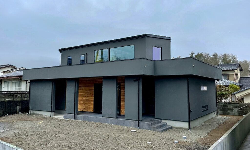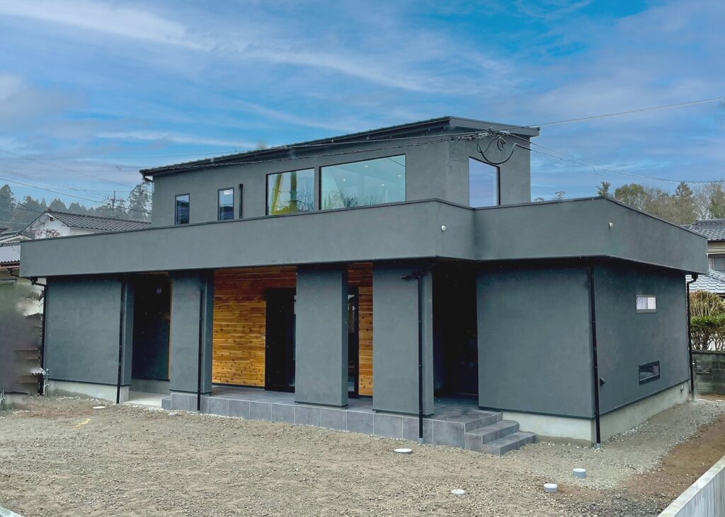 グレーの塗り壁とレッドシダーが重厚感のある外観のS様邸。